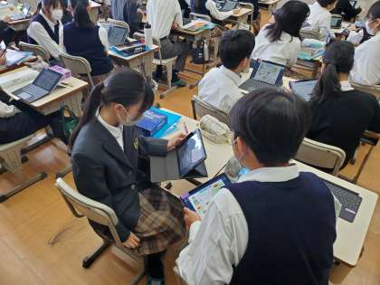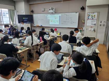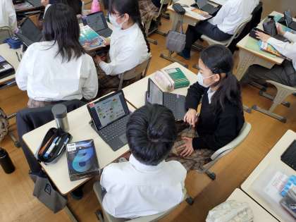 学んだことを振り返る方法はたくさんあります。今日の授業では、教科書のポイントとなるイラストがまとめられたスライドを基に、自分で英文を咀嚼し、ペアに伝える練習をしました。単なる暗記ではなく、ストーリーとして理解してるか。そのことを順序だてて伝えることができるのか。イラストを基にして説明することはよくありますが、原稿を見ずに話すには力が要ります。みなさん、どんどんスキルアップしていきますね。たくましい限りです。