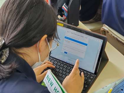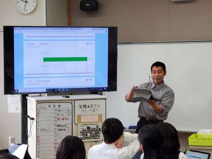 教科書の基本事項が定着しているのか。ベースとなる部分が抜けると、その上に学びを構築していくことが難しくなります。今日は、Googleフォームを用いて、短答形式の問いに答えていきました。選択であったり、文を入力したり、いろいろでしたが、みなさん、スイスイと回答していましたね。また、正誤について、入力とともにすぐにリアクションが返ってくるので、使いやすいですね。加えて、先生が回答状況を把握できるので、正答率が100%であったり、誤答傾向を見て取れたりします。