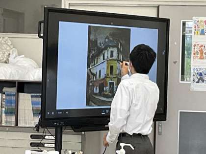 2年生の美術では、平面に表現されている絵画が、奥行きのある空間として、観るものを引き付けるのはなぜかを、電子黒板をつかって分析しています。