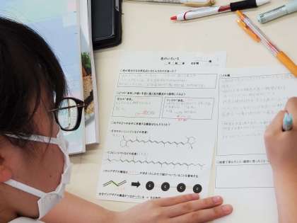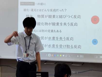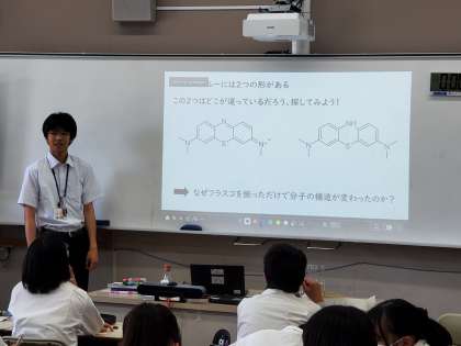 高校の先生が「色」に焦点を当てて授業をされました。高校1年の科学で習うす」に焦点を当てて授業をされました。ちょうど今習っている酸素による酸化還元反応に加え、水素に着目した酸化還元について説明があったり、有機化学の視点での反応式を眺めたり、色について深く考えたりと多岐にわたる話がありました。中には難しい部分もあったと思いますが、関心を持った部分については、独学で学びを進めていってほしいところです。気になる点や困ったことがあれば、中学の先生だけでなく、高校の先生にも相談し、科学の見識を広げてください。