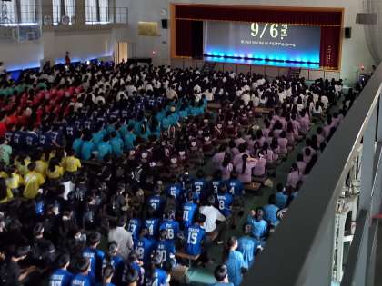 今日は西京祭文化の部2日目です。高校生の司会者の高いテンションで、2日目朝の集いが始まりました。1200人集まったアリーナは壮観です。少し暑いのが気になりますが、皆さん、一日体調には十分気を付けましょう。