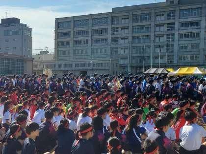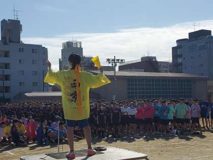 今年度は中高合同開催に向け、応援団が復活しました。中高体育委員の事前打ち合わせから積み上げてきたネタの数々が楽しみです。開会式では各団長からの掛け声に、色ごとに400人が声を上げる様子は壮観です。一致団結して盛り上がっていきましょう!