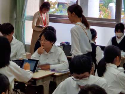 年次研修として公開された3年の英語の授業に、多くの先生が集まりました。ロイロノートで情報を共有する流れは、日常的でスムースです。難しい課題にもかかわらず、じっくりと考え粘り強く取り組むことができていましたね。3年後期の英語は、かなり難しい。課題に対する自分の考えを整理することから難易度が高く専門的で、それを英語でどう表現すれば的確に伝わるのか。時制やイディオムなど、英語は深い。思いを相手に伝えられるよう、工夫していきましょう。