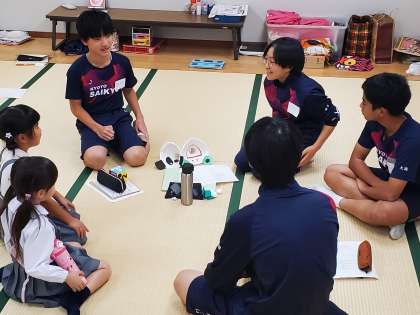 本日、安井幼稚園の児童が来校しました。幼児に関する授業の一環で、例年お世話になっています。本校生徒たちは、この日のためにどのように対応することが幼児にとってベターなのか考え、また幼児と一緒に遊べる作品を準備して挑みました。