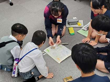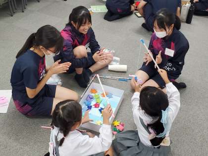 準備した遊び道具を通して、普段なかなか触れ合う機会のない幼児と交流しました。話し方だけでなく、目線や動きに至るまで、想定通りにいかず、うまくいかないことも多々あったことと思います。生徒自身、幼児だった時期があったことを思い出してくれたでしょうか。他者の立場に立って、その特性を知って対応することの難しさを感じてくれれば、これからの働きかけにプラスになると思います。