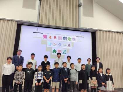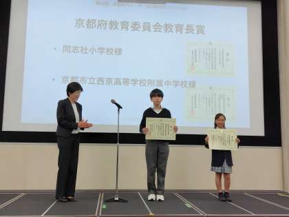 「第48回 京都府内小・中・高校創造性コンクール」にて、京都府教育委員会教育長賞をいただきました。これは、学校賞です。(表彰式で賞状を授与されているのは、2年S・Hさんです)そのほかに、個人賞で2年W・Rさんが銅賞をいただきました。表彰式の作品は、幼児のおもちゃ(家庭科で保育実習の際、幼児と遊ぶために作ったもの)です。できた作品の仕上がりだけでなく、作る過程も大切に審査が行われ、特に、相手への強い思いを感じる作品や情熱を感じる作品が賞をいただいているとのことでした。