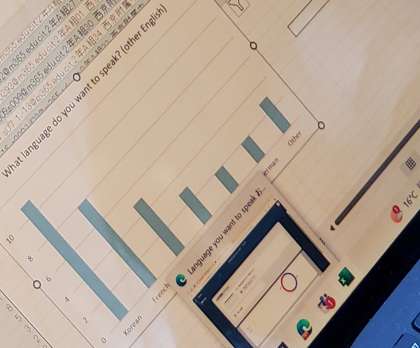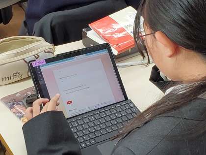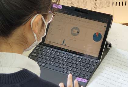 「最近本を読んでいますか」「あなたのボーリングのスコアを教えてください」「お寿司は好きですか」個々で質問項目を英語でformsで作成したものを、teamsにアップします。友達の質問に英語で答えつつ、自分のアンケート結果をexcelでグラフ化し、PowerPointのスライドにまとめていきます。これらを一貫してタブレット上で英語で処理し、最終的にはスライドをもとに英語で交流します。さまざまなソフトを活用する情報処理能力×英語実践力で、使える英語力を育成しています。