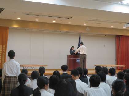 11月12日(火)の7限目に「令和6年度 新生徒会本部役員・新学級委員 認証式」が行われました。旧生徒会本部役員一人一人から、今までの生徒会活動の振り返りや本部役員を終えての感想などを話してもらいました。その後、選挙管理委員長から新生徒会本部役員の認証、新旧生徒会長による生徒会旗の引き継ぎ、新生徒会長からのあいさつなどが行われました。例年は各教室でクラスごとに後期学級委員の認証が行われていましたが、今年からは代表専門委員会で各委員長からの認証となりました。全校生徒が見守る中、21期生徒会は先輩方が築いてきた西京の伝統や熱い思いを受け継ぎ、唯一無二の西京を創り上げる新たなスタートを切りました。