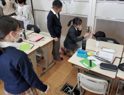 今日の授業では、「鏡と自分との距離が変わっても、自分の身長の半分の鏡であれば全身を映すことができる」ということを、体験的に学びました。確かに手鏡に顔を映したとき、鏡に顔を近づけても、遠ざけても、鏡に映る自分の顔の大きさは変わりません。「顔の大きさ」の定義が難しいですね。距離が離れるともちろん見た目の大きさは小さくなります。鏡自体が小さく見えますから。正確には「鏡の中に占める顔の割合が変わらない」ですかね。