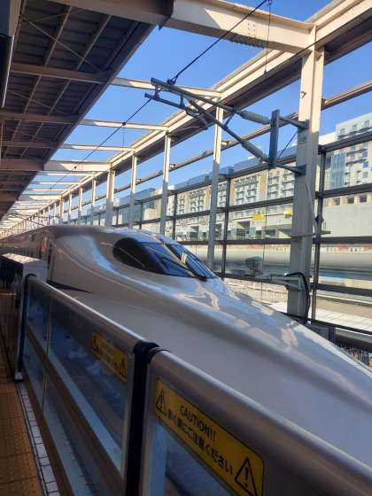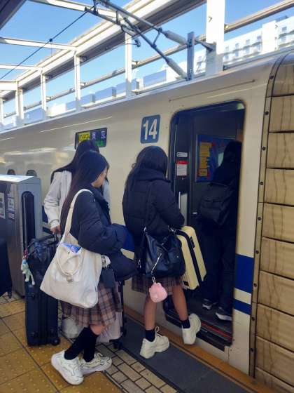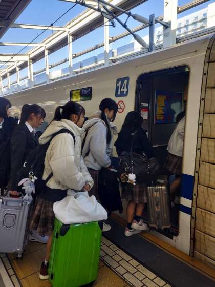定刻通り、新幹線に乗り京都を出発しました。京都駅は新幹線の途中駅なので、停車時間が1分程度です。みんなスムースに乗車することができたようです。幸先良いです。