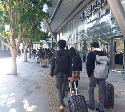 東京につきました。今からバスに乗り、クラスごとに大学へ向かいます。A組は早稲田大学で、B組は立教大学で、C組は法政大学で留学生と国際交流を行います。