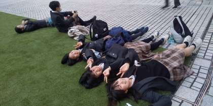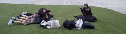 都庁の中庭にある広場でほっこりタイムです。見上げた空には飛行機が飛んでいて、生徒たちは各々カメラを向けていました。この後は3クラス集まって夕食です。