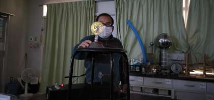 「電流とその利用」の授業では、真空放電の実験を行いました。真空ポンプで放電管内の空気圧を小さくし、誘導コイルで大きな電圧をかけると、電流が流れてガラス管が光る様子を観察しました。この実験を通じて、電流の性質とその利用について学びました。