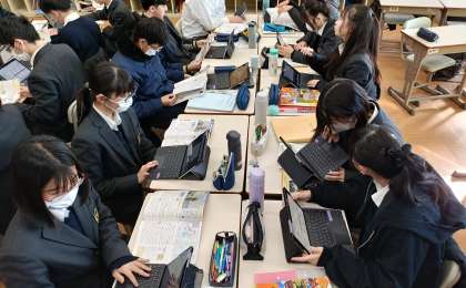 ペリー来航に対して、どのように対応すべきかシミュレーションしよう。歴史に「もし」はご法度かもしれませんが、思考実験してみることは大切です。そのために、ペリーが来航してきたときの日本の情勢について、詳しく分析しておかなければ、判断の根拠を見失います。今日は、各班ごとに、政治担当、軍事担当、外交担当、財政担当、産業担当に分かれ、それぞれで当時の日本を調べ、思考ツール(フィッシュボーン)にまとめました。ファシリテートする生徒もいて、班の中でうまく議論が進んでいたようです。これを軸に、次回どのような判断をするのか、とても楽しみです。