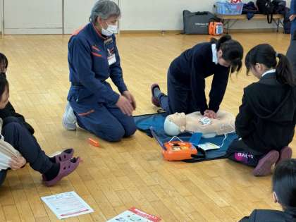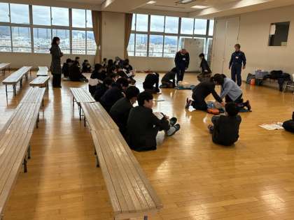 3月4日(火)13時30分から2時間、本校メモリアルホールにて「普通救命講習」が実施されました。参加者は、保健委員、防災リーダー、水泳部、50名程度の参加がありました。