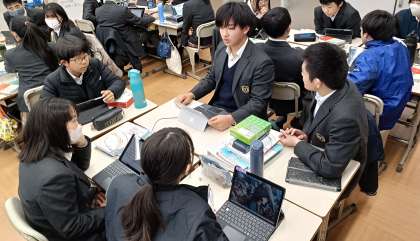 ALTのルーク先生からの出題でアクティビティーを行いました。自身に関する3つの英文を書き、そのうち1つ嘘を混ぜます。班ごとに発表し、英語で質問しながらどの分が嘘かを見破れるかというものです。なかなか白熱していました。