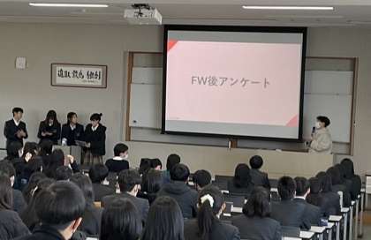 3年生も残りわずかになってきました。今日は大講義室でM9東京FWを振り返りました。実行委員長をはじめ各部門長が、取組を振り返り課題を抽出するとともに、次につなげるにはどうすればいいか。熱く語っていました。