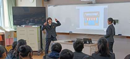 グループごとに創作した英語の寸劇を披露しました。全員が声をそろえて「Action!」と言うと寸劇が始まりました。英語でのセリフにもかかわらず、スムーズな進行で観客も大いに笑い、楽しんでいました。テンポも良く、内容も分かりやすかったため、みなさんの反応も非常に良く、クラス全員が一丸となる素晴らしい時間でした。