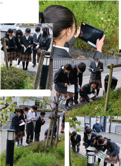 理科の授業では、タブレットを持って学校に生えている野草の観察に出かけました。ふだんは見落としがちな野草。でもいろいろな種類があることに驚きです。すぐには名称を特定できなくても、観察と写真で、教室に戻ってから再度調査を行います。班で活動していると自然と役割分担がなされ、1年生でまだであったばかりにもかかわらず、チームワークが出来上がっていました。すばらしい連携です。