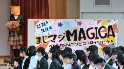 新入生が入ってきて、在校生がそわそわしている様子がうかがえます。新たな後輩ができることへの期待と不安が入り混じっているようです。生徒会本部からは生徒会活動や各種委員会の取組について紹介がありました。堂々とそしておもしろおかしく伝える様子はさすが先輩です。