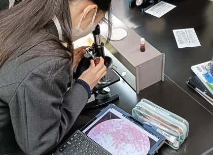 顕微鏡を使ってねぎの細胞分裂を観察しました。生徒たちは、ねぎの根端の細胞が分裂する様子を興味深く観察し、細胞の成長と分裂の過程を学びました。顕微鏡を通して、細胞が分裂して新しい細胞を作り出す様子を確認し、生命の基本的な仕組みを理解する貴重な体験となったことでしょう。この実験を通じて、生徒たちは科学への興味を深め、観察力と分析力を養ってくれればと思います。