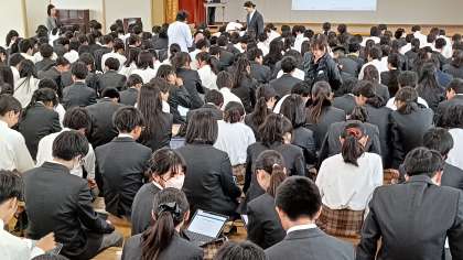 認証式の後、Slidoを使ってみました。メモリアルホールで360人の接続確認を兼ね、ライブ投票が可能なアプリSlidoを試してみました。質問のたびに、ゲージが変化していく様子に、生徒たちはくぎ付けになっていました。いろいろなICT機器を活用し、より効果的な授業を進めていければと考えています。