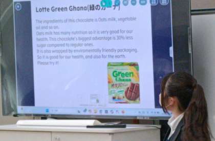 エシカル消費とは、人や地球にやさしい商品を選ぶことです。たとえば、環境にやさしい素材を使った物や、働く人がきちんとお金をもらえるように作られた商品を買うことです。自分の買い物で社会をよくすることができます。授業で習ったことを自分たちの言葉で咀嚼し、グループでまとめ、英語で説明をしました。