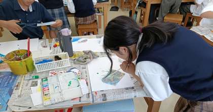 絵を描く技法を習っています。デカルコマニーやスパッタリング、ドリッピング、マーブリング、吹き流しなど個々で挑戦しました。これらを組み合わせ今後さらに個性豊かな作品を作っていきます。仕上がりが楽しみです。