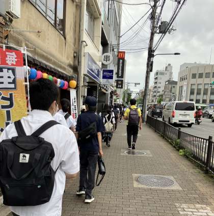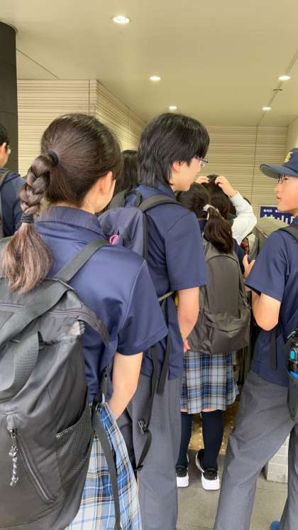 2年生は、ジョーシン電気さんの駐車場に集合しました。場所を貸していただきありがとうござます。現在西院駅に到着し、これから電車に乗って万博会場に向かいます。