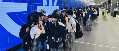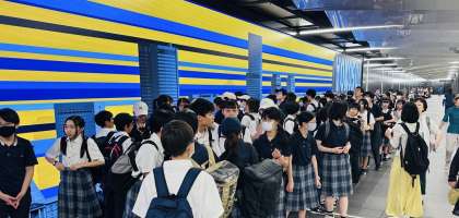 夢洲駅に到着しました。万博の雰囲気が漂っていますね。夢洲駅は終着駅なので、ここで降りる人は基本的にみなさん万博に行く人です。駅全体からワクワクとしたオーラを感じます。