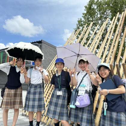 日傘を差したり帽子をかぶったり熱中症対策は万全ですね。これから西ゲートの先にある「未来の都市」に向かうところです。