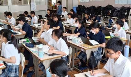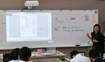 辞書にはいろいろな情報が詰め込まれています。「at」を引くと、単語の横に「前」という記号がありました。これは何でしょう?他の単語を見ると「動」や「名」というものもあります。前置詞というキーワードをもとに、「今まで習った単語にも前置詞はあったよ」という問いかけに、それぞれあれだこれだとどんどん出てきました。個別に覚えるのではなく、つながりを意識して覚えることも大切ですね。