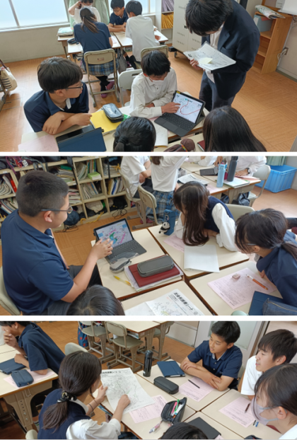 九州地方について学びを進めてきました。九州地方の地形や産業、人口分布や観光資源、道路網や雨温図など様々な視点があります。それらを単体でとらえるのではなく、関連付けると新たな発見がうまれてきます。「九州の沿岸部に港がたくさんあります」「この部分に港がないのはなぜ」「平野だからだよ」「平野なら港がないのはなぜ?」「人口が集まっているからだよ」「どういうこと?」などなどグループで応答がなされていきます。今日の視点を他の地方でも生かしてください。