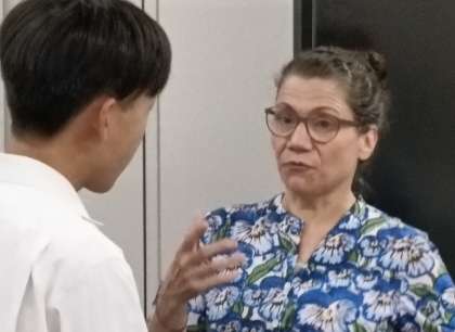 第一部では日本伝統部を中心に国際茶会を行いました。その後、第二部では3年有志を中心に、スイスのチューリッヒ応用科学大学の方々の講演を聞きながらディスカッションを行いました。VR体験をさせていただいたり、AIについて議論をしました。1時間30分ほどの交流でしたが、終わってからも直接講師の方々に質問に行くなど、積極的な姿勢に感心しました。生徒たちにとって、AIやVRといった最先端技術は関心が高いのだと感じました。今日得た知見をぜひ深掘りしてください。