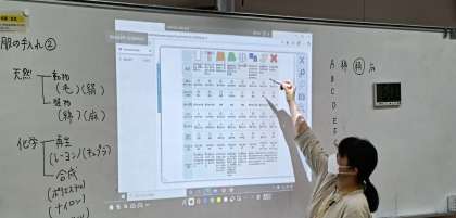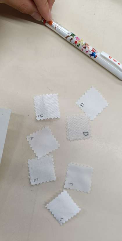 繊維の種類に応じた衣服の手入れについて学びました。衣服の繊維には綿・ウール・ポリエステルなどがあり、種類によって手入れ方法が異なります。洗濯表示をよく見て、素材に合った洗い方や干し方をする必要があります。7種類の端切れを元に、触って種類を確認しましたが、当てることはできましたか?今後服を着るとき、素材についても意識を持って確認してみましょう。