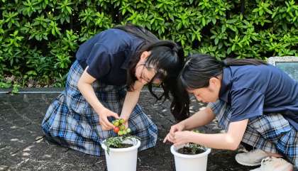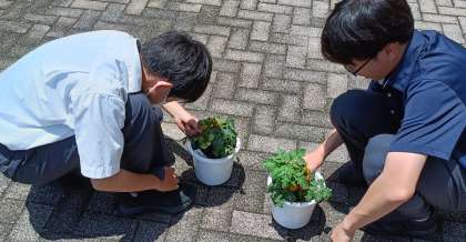 技術の授業で育てたトマトが、いよいよ収穫の時期を迎えました。生長を促すために摘芯や摘芽を行い、日々の観察と水やりを欠かさず世話を続けてきました。実が赤く色づき、立派に育ったトマトを一つひとつ丁寧に採集しました。自分たちの手で育てた作物の成長を実感し、栽培の楽しさと達成感を味わうことができました。