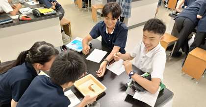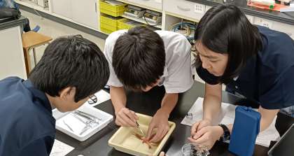 今日は解剖をしました。甘エビやカタクチイワシをピンセットやハサミを巧みに操り解剖して観察をしました。脊椎動物と無脊椎動物の体の特徴を見て取ることはできましたか?なんだか美味しそうな匂いがする中、みなさん頭をつき合せ、解剖をしていました。普段あまりじっくりと見ることはありませんが、今日の発見を忘れないようにしてください。これから晩御飯を食べるときは、少し観察してみましょう。