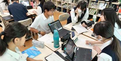 1分30秒のプレゼンの後、2分間の質疑応答の時間を取ります。すべて英語でなされるやり取りに、みんな真剣な表情で取り組んでしました。テーマが難しいので、特殊な単語も多々現れ、説明するほうも聞く側も、一言一句聞き逃しのないよう集中していました。まとめられたスライドに頼らず、相手の表情を見ながらプレゼンを進めるあたり、さすが3年生です。今日は家に帰って、Teamsにプレゼン動画を提出します。AIによるプレゼンの評価を参考により高みを目指してください。