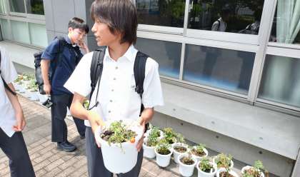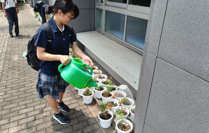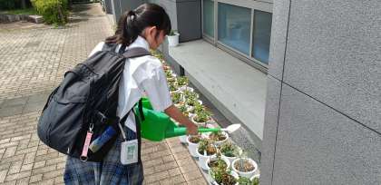 技術の栽培で取り組んでいるトマトがたわわに実を実らせています。ここのところ暑かったこともあり、一気に実が赤くなり食べ頃を迎えました。2年生は午後から企業訪問に出かけるので、出発前に水やりをしていました。ご苦労様です。