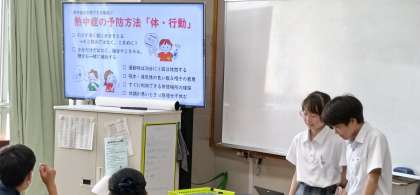 保健委員がスライドにまとめクラスの仲間に伝えました。熱中症のついての基礎知識とその対応について、具体的に話しました。また、熱中症になった場合、翌日以降も体調が完全に戻るわけではないという共有をしました。