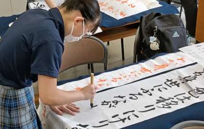 有志の書道好きが集い、懇談会の裏の時間帯に書道室で書をたしなみました。講師の先生をお招きし、見本をもとに繰り返し書きます。個別に指導を受けながら、書き進めるうちにどんどん上手になっていきます。作品の完成が楽しみです。
