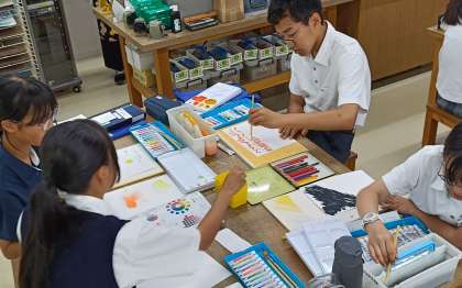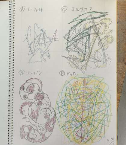 モーツァルト、ショパン、コルサコフ、バッハの代表曲を聞き感じたことをそのまま色鉛筆でデッサンをしました。個々、色とりどりの作品が見られました。その中から表現したい曲を選び画用紙に絵の具で作品を仕上げていきます。クラシックが流れる優雅なひと時。音楽と美術が溶け合っているようでした。生徒にとっては「同じ」なのかもしれません。完成が楽しみです。