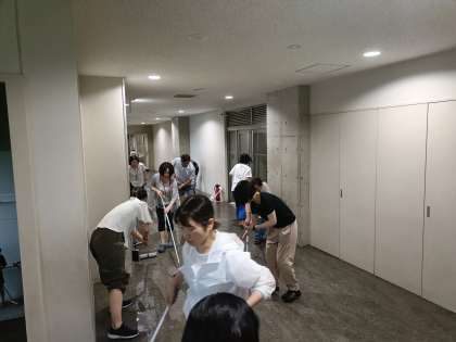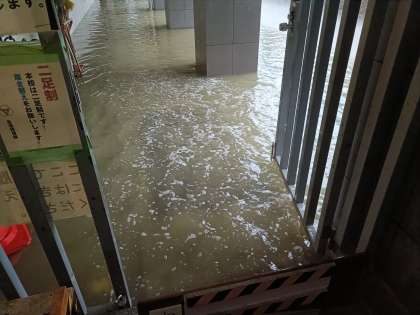 25日月曜日、中京区で雷鳴とともにまさにバケツをひっくり返したかのような集中豪雨が起きました。学校でも急いで窓を閉めてまわり、部活動中の高校生は建物の中に一時避難する騒ぎとなりました。そんな中、西館の4階で、アリーナ東側中庭から浸水があり、校舎内とくに北階段が水で溢れ滝のような状態でした。また、グラウンド南側の校舎との間が池のようになり、本館と東館の間は御池通に向かって川のような状況でした。