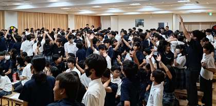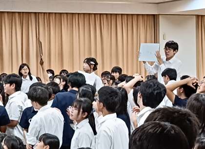 西京生近似値クイズでは、事前に調査したアンケート結果をもとにしたもので大盛り上がりでした。各クラスで予想した割合との誤差の分だけ生徒が着席していきます。予想から大きくかけ離れた結果に叫び声があがり、ニアピンの結果に乱舞している姿はほほえましかったです。「この二日間、楽しかったですか?」この問いに、迷うことなく一堂に手が上がったことが、文化の部成功を表していました。
