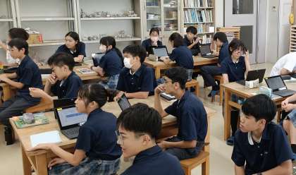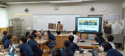美術の授業で琳派の代表作「風神雷神図屏風」を鑑賞しました。俵屋宗達、尾形光琳、酒井抱一の三者による作品を比較し、構図や色彩、筆遣いの違いを通して、それぞれの時代や美意識の違いに触れました。金箔の背景に浮かび上がる風神・雷神の姿に、生徒たちは強く惹きつけられ、琳派の技法や表現の美しさを実感。今後は鑑賞を通して得た学びをもとに、自分の作品にも工夫を凝らし、創造力を高めていきます。