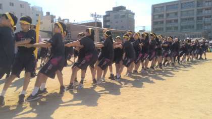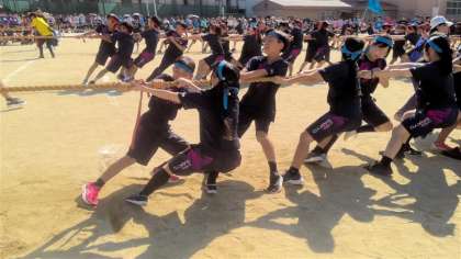 綱引きはクラス対抗です。各クラス作戦通りに綱を引けてますか?みんな大きな声を出しながら力いっぱい綱を引いています。一進一退の攻防で、綱が右に進んだと思えば左に動き、なかなか勝負がつきません。がんばれ〜!