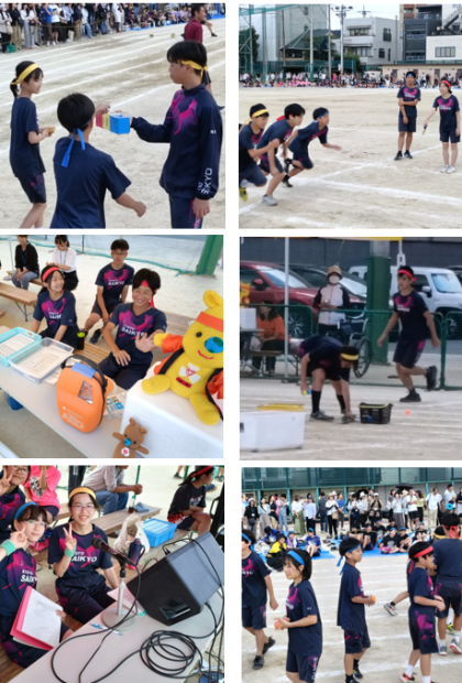 係担当の生徒も大活躍です。放送部による丁寧で盛り上がる放送をはじめ、大きな声で合図を送る出発合図の生徒会本部、着順ごとに得点カードを渡す決勝審判の環境委員、エントリー名簿を確認する招集の体育委員、スタート位置まで誘導する誘導の図書委員、競技ごとに準備後片付けする用具の代表・文化委員、得点記録集計の生活委員、救護の保健委員、ライン引きの陸上部と、それぞれの役割をていねいに行っています。こうした縁の下の活躍があるからこそ、体育の部が円滑のそして楽しく進めることができます。