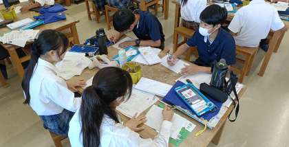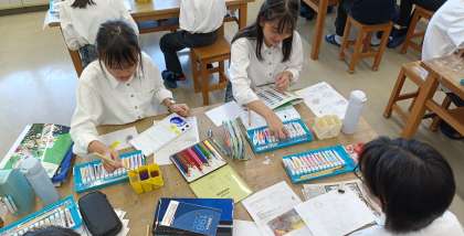 後期から1年生の美術は2時間連続の授業が基本形となります。今日は琳派の技法や色彩を意識しながらオリジナルの絵の構想を練りました。それらのどのように色をのせるのか、絵の具を混ぜ色味やバランスを調整しながら準備を進めていきました。屏風の完成はまだまだ先ですが、琳派の仲間入りを果たしていきましょう。