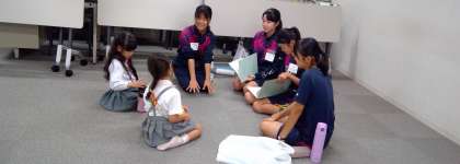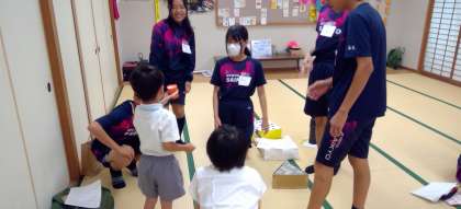 安井幼稚園の年長のお子さんたちが中学校に来てくれ、夏休みの課題で作ったおもちゃを使って、遊びました。始めはお互いに緊張していましたが、次第に打ち解け、どの生徒もいい表情で遊んでいたのが印象的でした。生徒にとって、とても良い経験になったと思います。