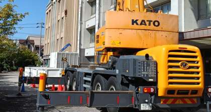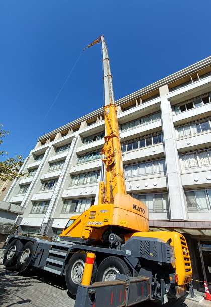 今日は80tレッカーが入り、本館屋上から古い冷却塔を取り除く作業が行われました。この後、新しい冷却塔が搬入され、冷却水機やポンプの設置が進むと、本館のエアコンも再起動します。楽しみです。